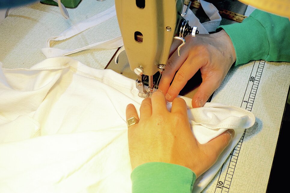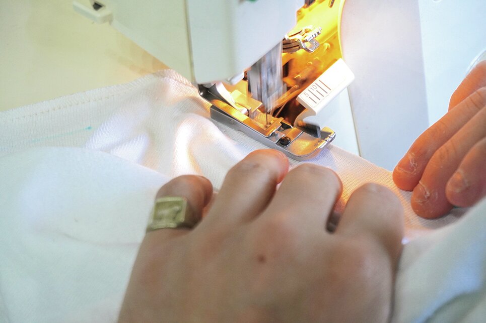 裁断した裾の端がほつれないようにロックミシンかける。生地自体にノビ、ヨレがあるため丁寧に。ここで裾をまっすぐに整えることも重要。
