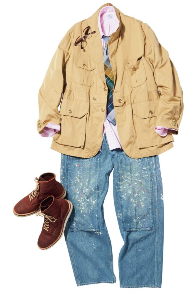 吉村 「オールドジョー」のペインターパンツがすごく良かったので、これを起点に考えました。カッチリした上半身をパンツで崩すという大枠がまず浮かんだのですが、アメカジ色を濃くしたかったので、アウターも武骨なほうがいいかなと。選んだのは「エンジニアド ガーメンツ」のラペルドジャケット。ノーフォークジャケットとサファリジャケットをミックスしたようなデザインで、カジュアルアイテムとの馴染みもいい。定番アイテムだと思うんですが、今季は光沢のあるツイル生地で、ハードな雰囲気のパンツを少しだけカジュアルアップさせてくれる感じがバッチリでした。