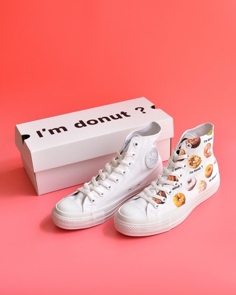 展開されるのは、シンプルで都会的な印象のロゴデザイン、“I’m donut?CLUB”のメンバーをあしらった総柄、そしてカラフルなドーナツをちりばめた総柄のプリントデザイン3種。さらに、今回新たにスタートするワッペンのカスタマイズサービスから“I’m donut?CLUB”の人気メンバーである「あいむくん。」や、「I’m donut?」のアイコニックな“?”の2種のワッペンも展開する。左右のアッパーで異なるデザインを組み合わせることもできる。タンには、右足に「I’m donut」、左足に「?」が入る仕様で、遊び心と個性が詰まった1足に仕上がる。シンプルで、尚且つ印象深い「I’m donut?」のボックスをモチーフにしたスペシャルなカートンも準備されている。
