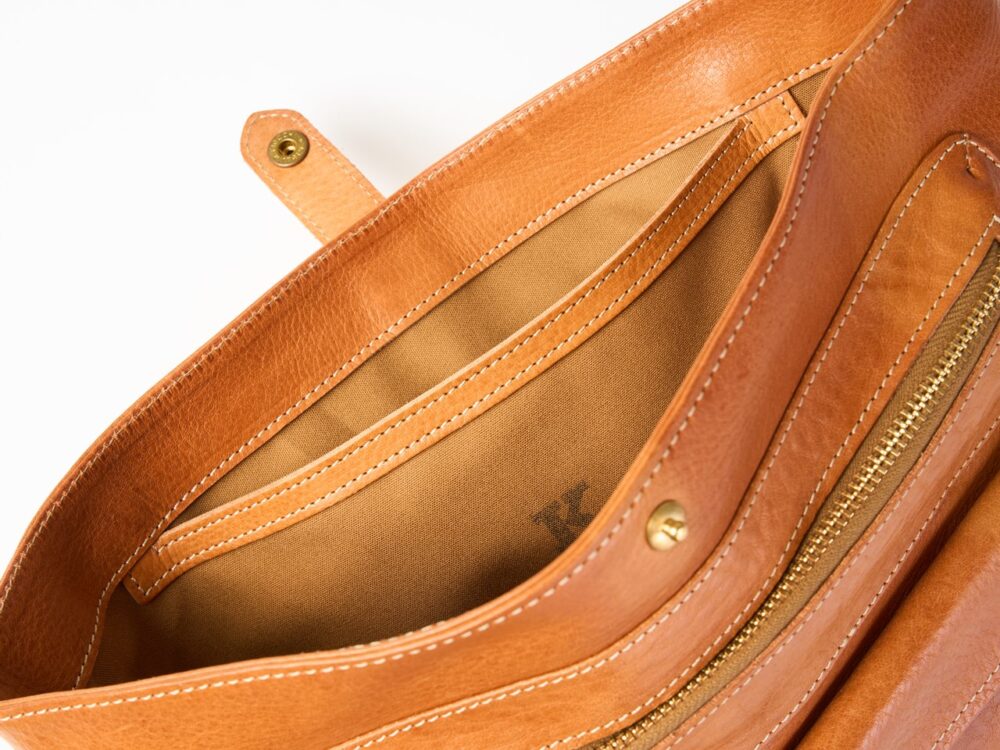 ボディには、イタリアの名門タンナー「アズーラ社」によるバケッタ製法のブルハイドレザーを採用。植物タンニンにケブラチョ、オイルにはイワシの内臓から抽出される“セゴオイル”を使う伝統的な製法で鞣された革は、しなやかでありながらコシがあり、荒々しさを抑えた上品な表情を持ちます。レザー好きにもたまらない仕上がりです