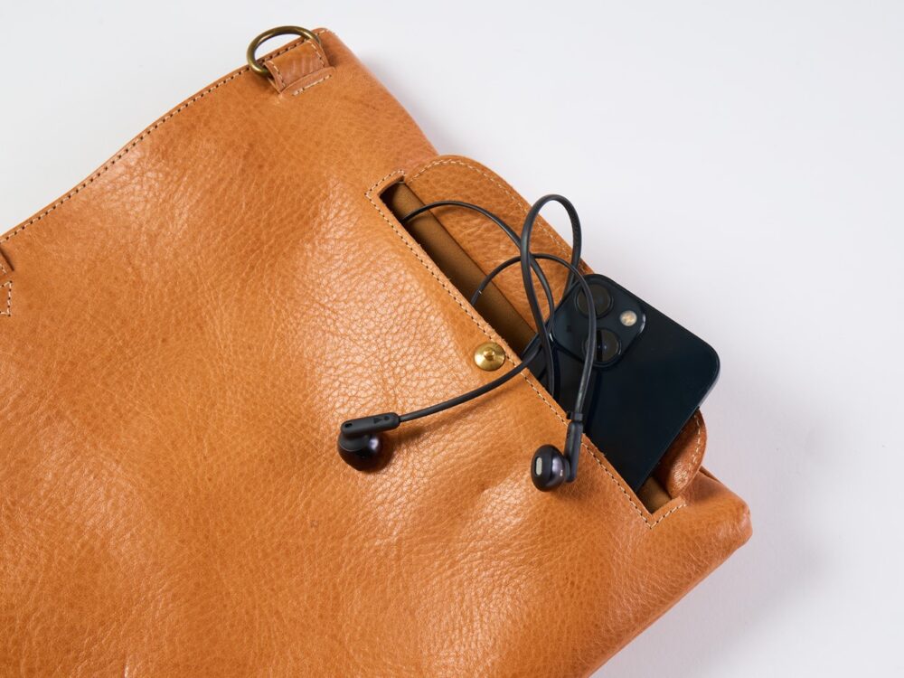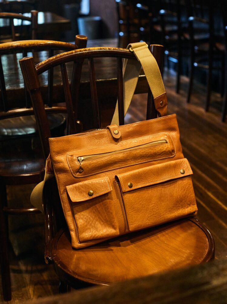製作は、レザーアイテムを一点ずつ手作業で仕立てる「キゴ」に依頼。細かなポケットディテールの再現力と、ブルハイドレザーのタフな質感、そして高い保護力を持ち合わせていることが決め手でした。