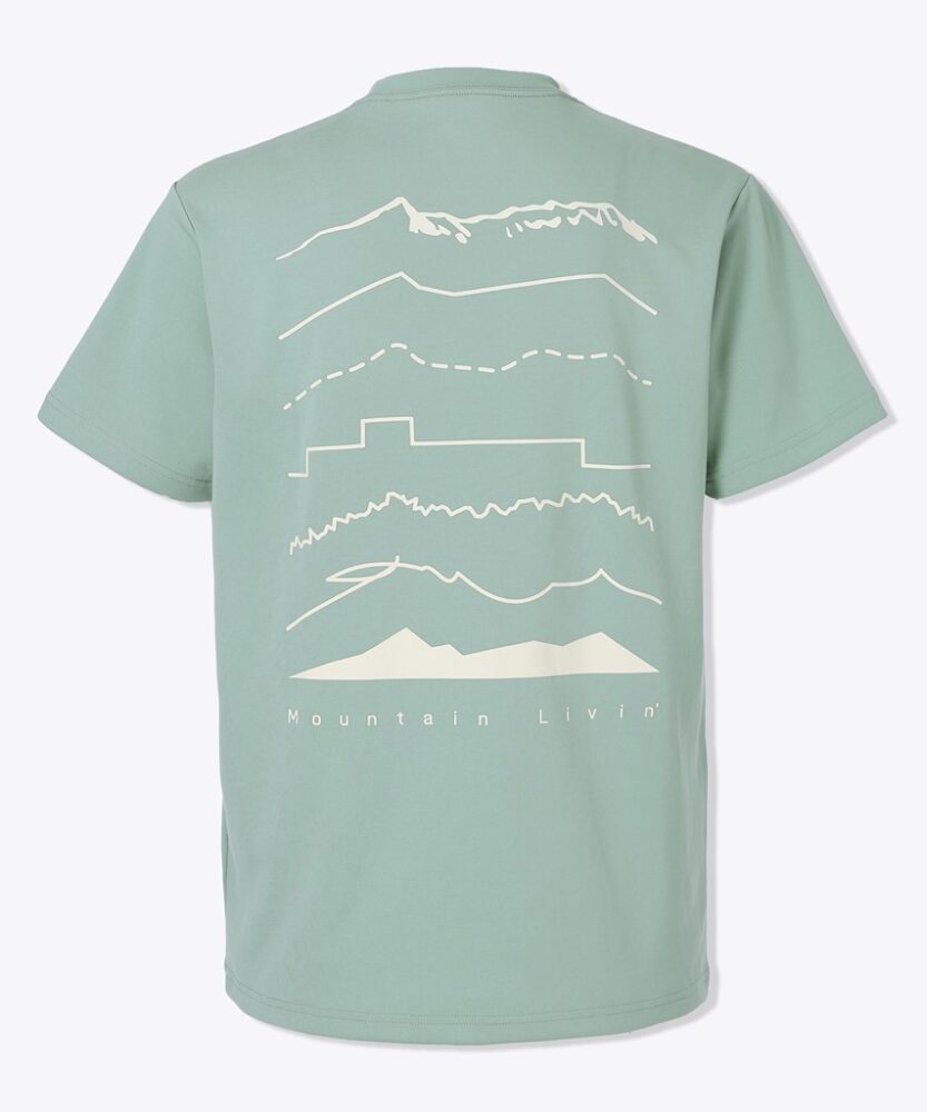 ●様々な山々とMountain Livinʻのメッセージが背面に、フロント左胸にはアメリカンハイカーのグラフィッ