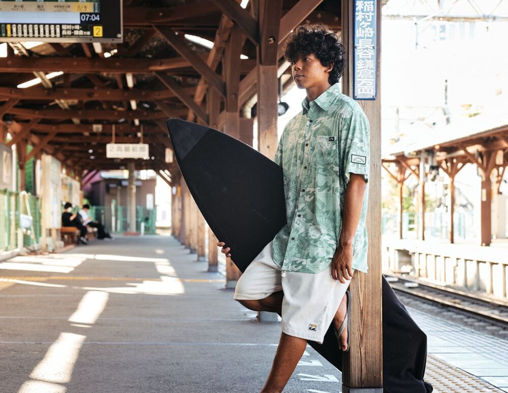 江ノ電駅員や売店スタッフが着用の、BILLABONG歴代ロゴがコラージュされた総柄デザインシャツのレプリカも登場!