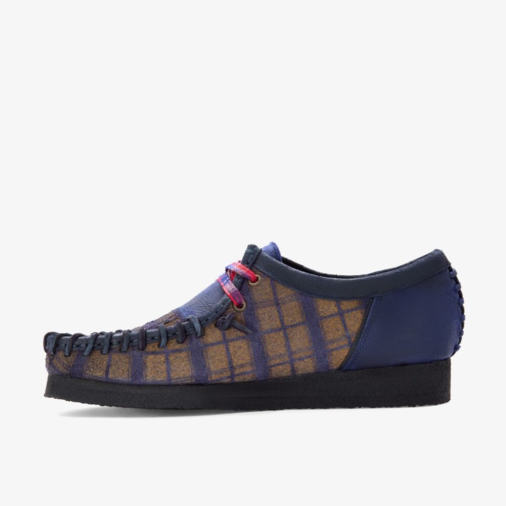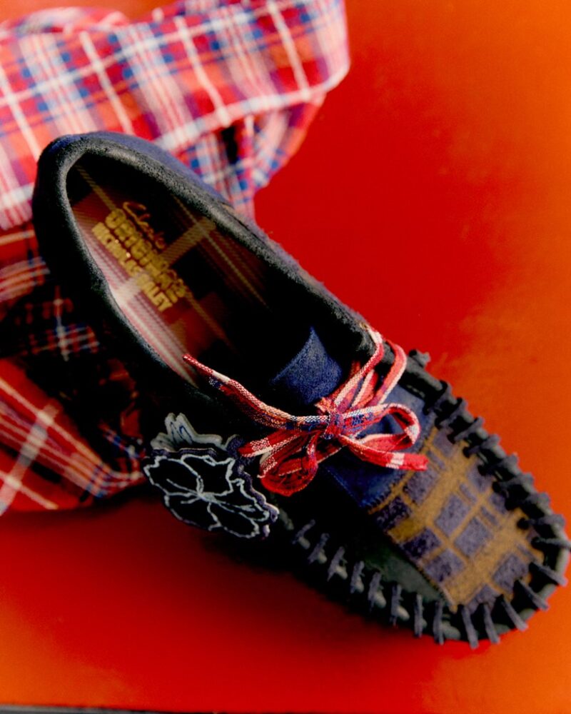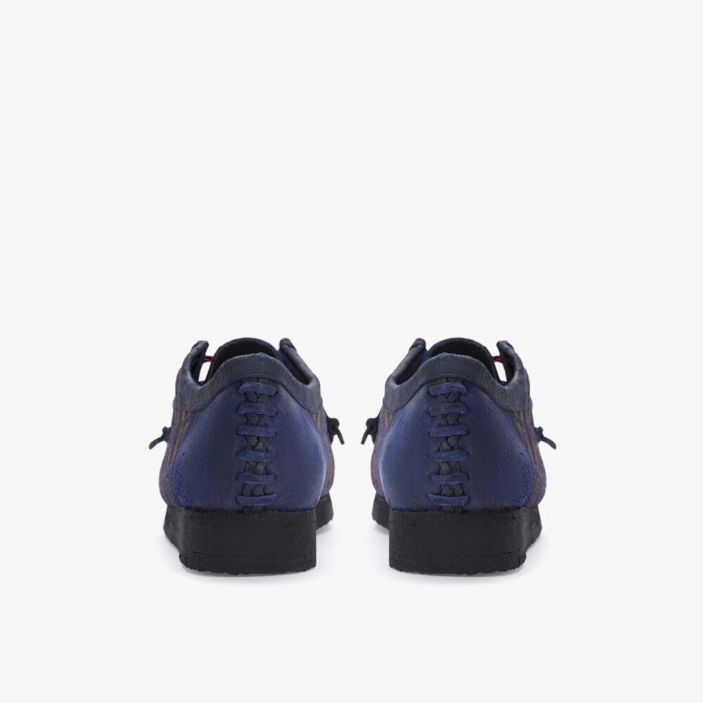 本コラボレーションモデルはブルーとレッドのタータンパッチワークを取り入れた新しいワラビーである。プレミアムスエード、ワックスドレザー、ヘアリースエードを組み合わせ、ヴァンプとヒールには独自のレザーステッチを施した。さらに、フラワーフォブやタータン生地のシューレースがアクセントとなり、クラシックなシルエットに現代的な個性を与えている。
