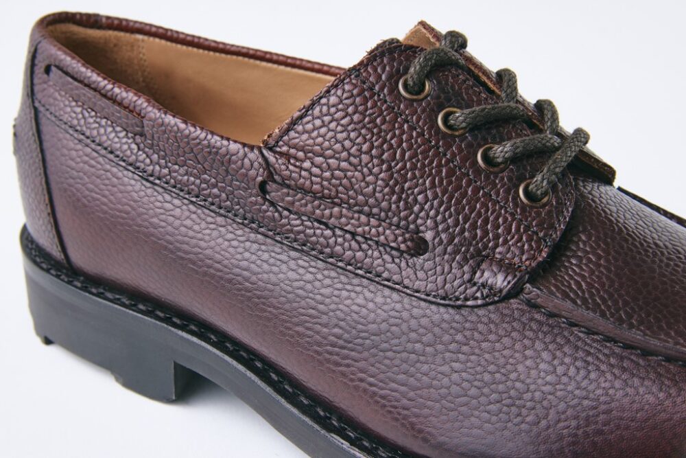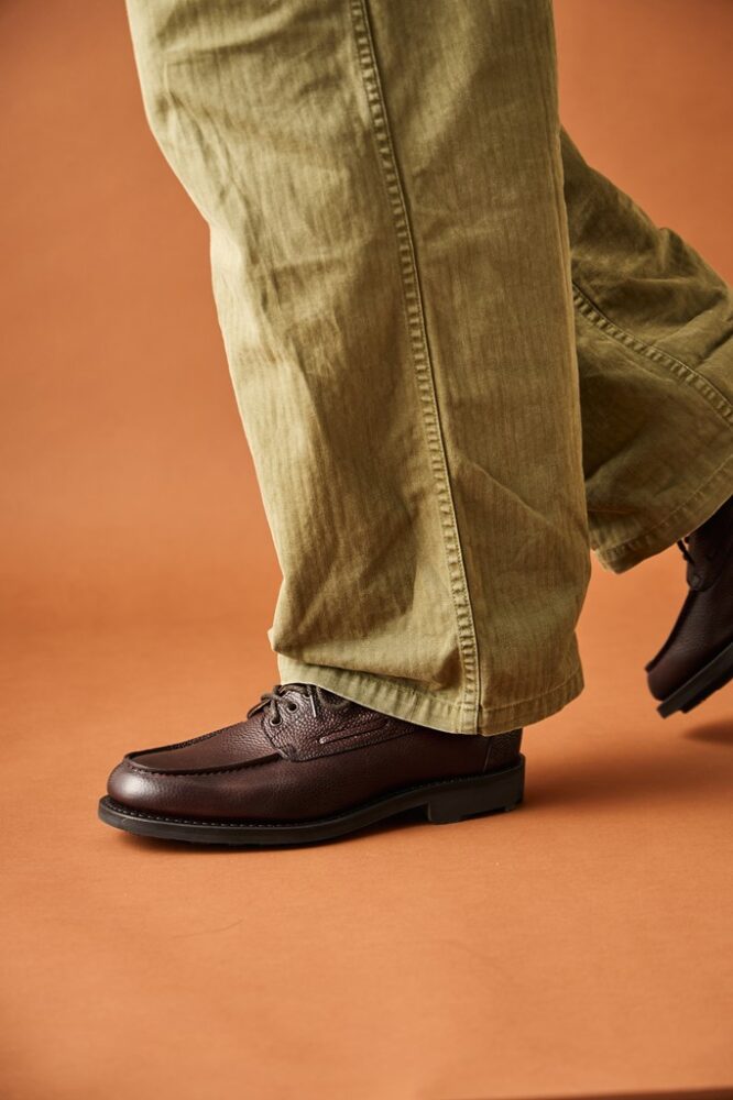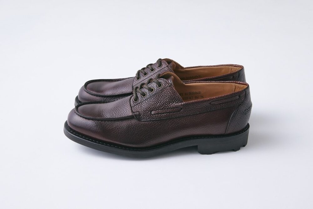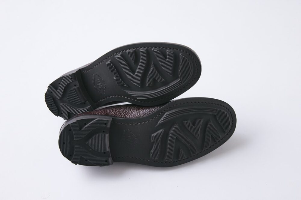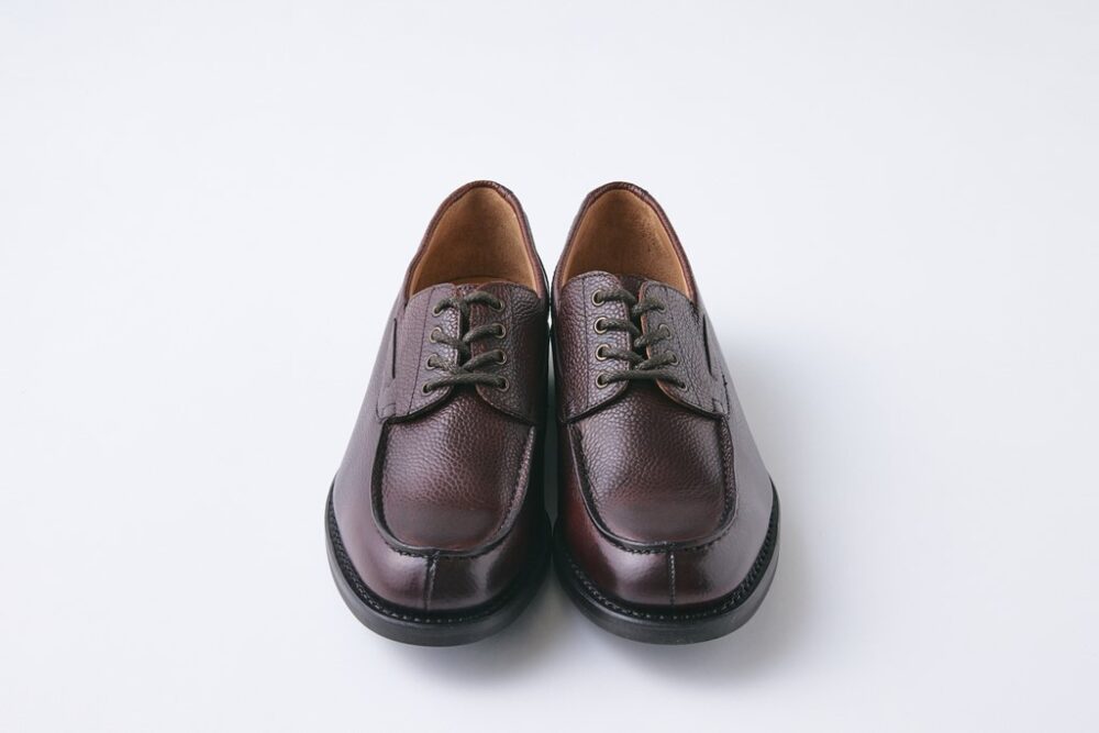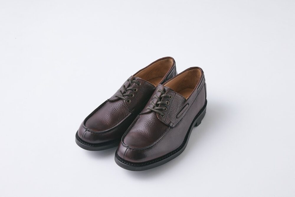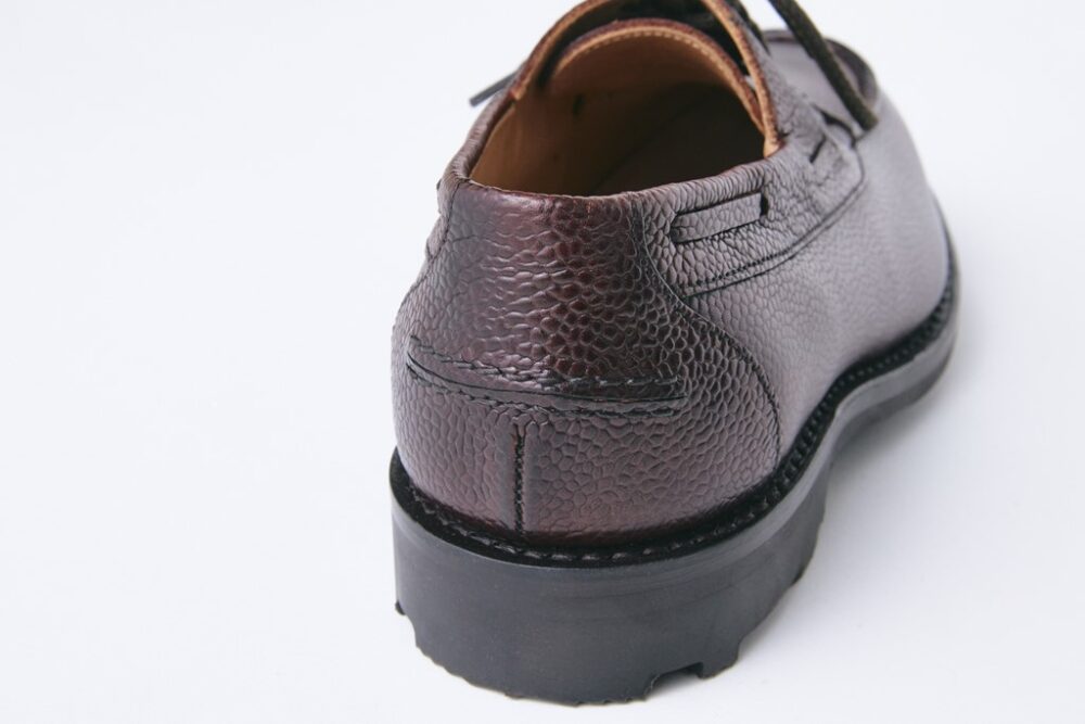 グレインレザーといえば、英国のカントリーシューズに多く採用され、シボが特徴で武骨なムードが漂います。今作はあえてアメリカンなバーガンディを選び、英米のテイストがミックスされた仕上がりに仕上げました。
