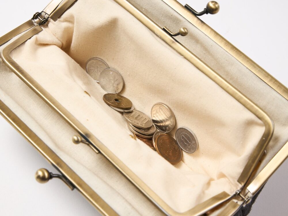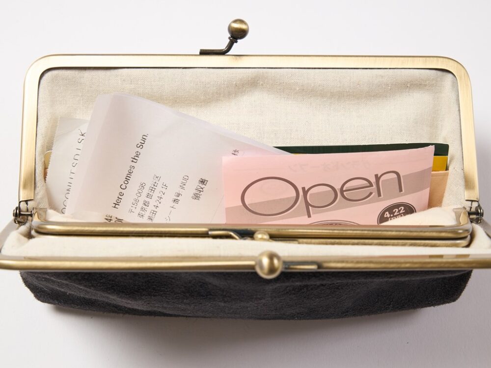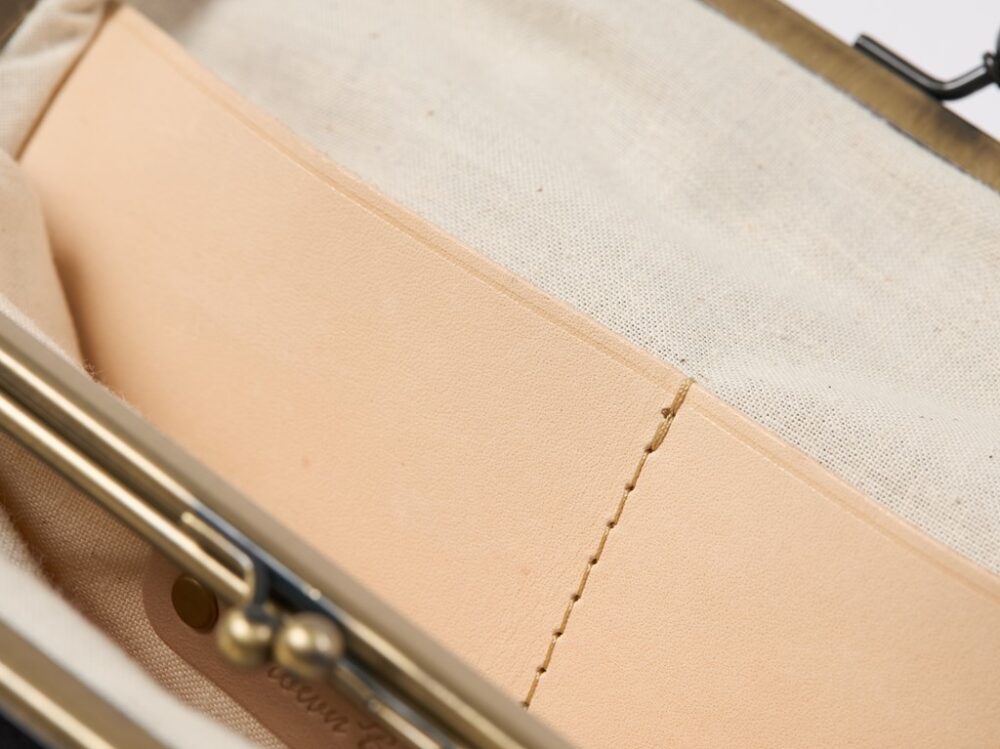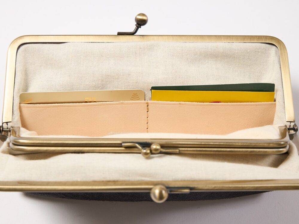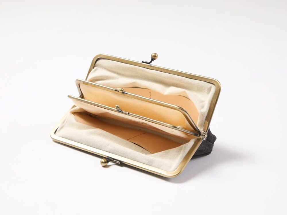 がま口財布を愛用する人からは「形は好きだが、お札と小銭を分けられないのが難点」という声をよく耳にする。しかし、この財布は二口の金具によってその悩みを解消している。さらに、開口部が大きく開くため、奥に入り込んだ小銭も容易に取り出すことができる。