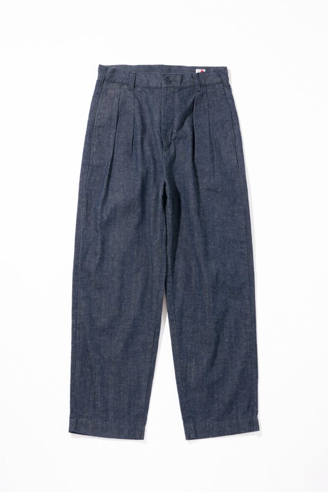 1961年にジーンズの製造を開始した「エドウイン」。ジャパンデニムの代名詞ともいえる同ブランドにおいて、代表的なのは5ポケットのワークデニムだが、ドレッシーな型である2タックデニムにおいてもそのクオリティは折り紙付きだ。フロントには長さ違いの2本のタックが入り、腰回りはゆったり。そして裾にかけてテーパードの効いた美しいシルエットが際立つ。よりドレッシーなインタックを採用することで、アイビールックなどのトラッドな装いとも好相性だ。生地には、タテ糸にムラ糸、ヨコ糸にネップ糸を使用した11オンスのインディゴデニムを採用。ドレッシーなディテールとヴィンテージ感のあるデニムの表情が絶妙にマッチしている。2万2000円