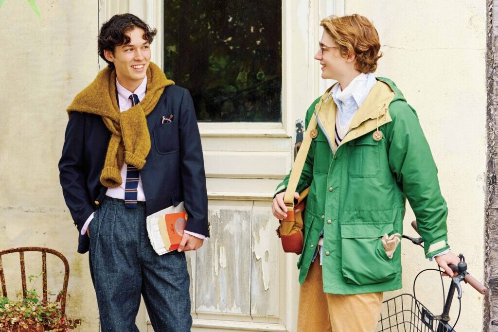 【左】トラウザーズ2万2000円/エドウイン(エドウインTEL0120-008-503)、ブレザー6万9300円、BDシャツ1万6500円、肩に巻いたシャギードッグセーター3万3000円/すべてJ.プレス オリジナルス(J.プレス & サンズ 青山TEL03-6805-0315)、ニットタイ1万8700円(グラストンベリーショールームTEL03-6231-0213)、シューズ6万8200円/サンダース(サンダースジャパンTEL03-6231-0115)、ポケットに入れたメガネ4万9500円/ジュリアス・タート・オプティカル(G.B.ガファスTEL03-6427-6989)
