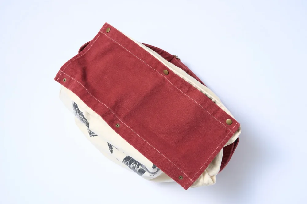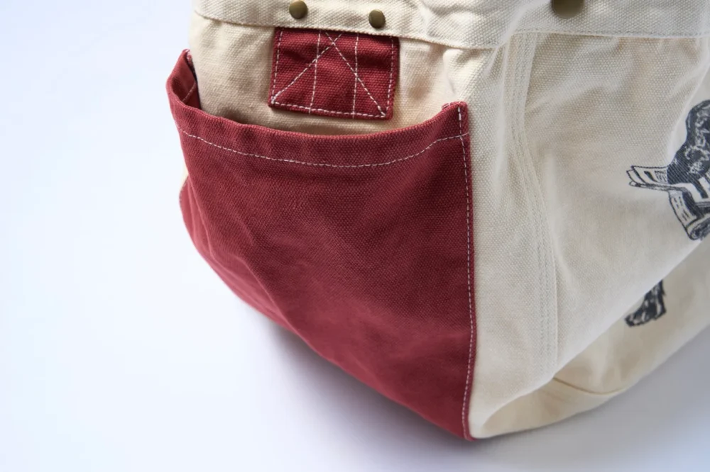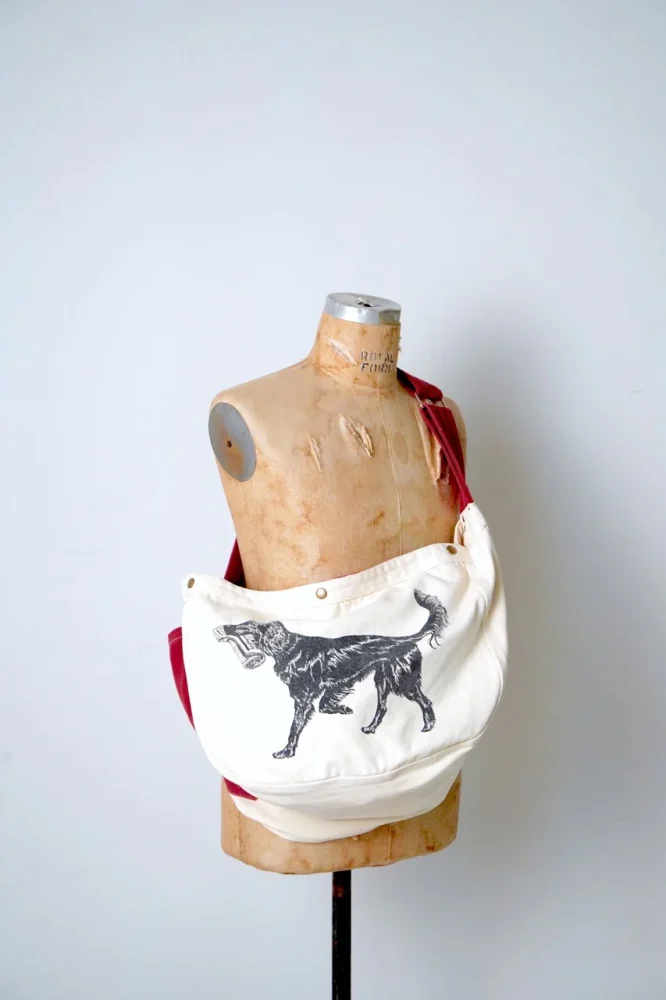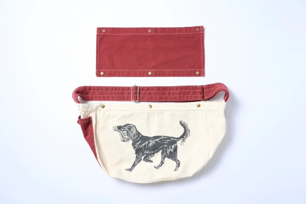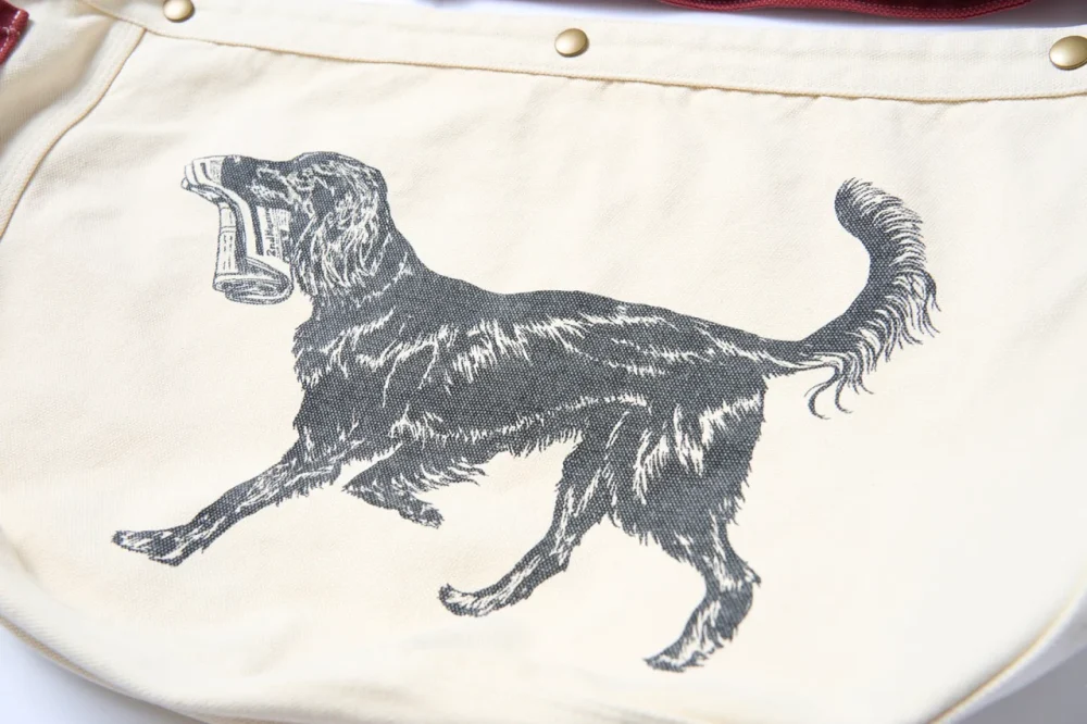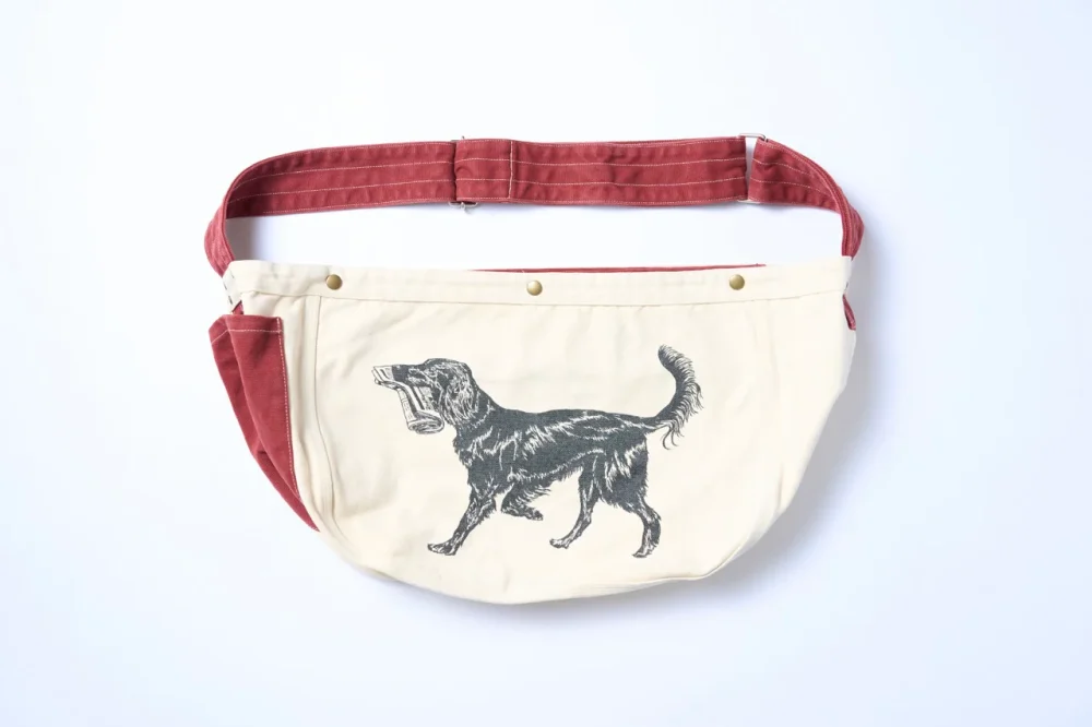 プリントは前回と同じく、新聞をくわえたアイリッシュセッター。ボディは生成り、ショルダーとポケットはアイビーリーグを思わせる深みのあるバーガンディ。アメリカのカレッジカルチャーを愛する方にぴったりのアイテムです。 デイリーユースはもちろん、コーディネートのアクセントにもおすすめ。上質な遊び心を日常に取り入れたい方へ。