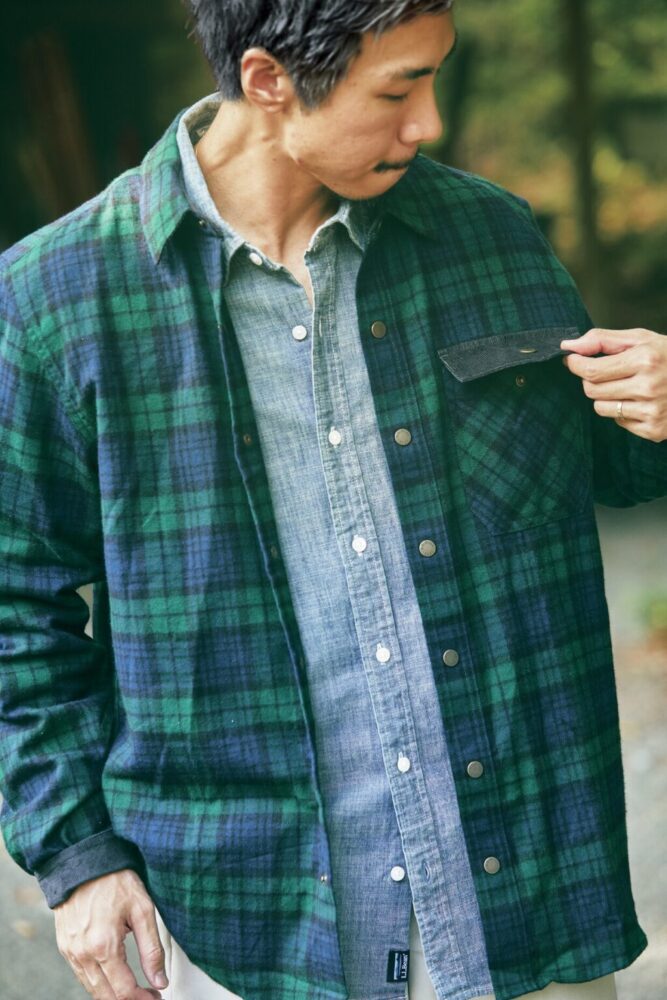 アイコンアイテムを引き立てる“名脇役”にして、存在感は主役級。1枚でも様になるモデルだ。上/ 誕生から85年以上続くロングセラー。職人の起毛加工と厳格な製品チェックが柔らかな着心地を生む。シャツ9900円 下/ ボタンをスナップに変更、ポケットの切り替えなどもアップデートされ、インナーにもアウターにも使いやすい1着。フランネルシャツ1万2100円、シャンブレーシャツ1万1000円