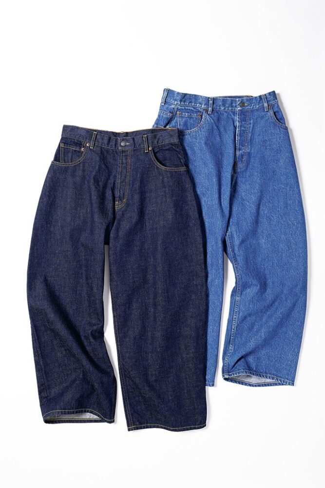 岡山産のデニムを採用した[ホリー]は、5ポケット仕様でクラシック。「スタジオニコルソン」らしいバルーンシルエットで、セルビッジ使いのコインポケットは〈ビームス プラス〉らしいこだわり。各4万4000円