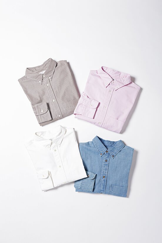 ボタンダウン、サイドガセット、背面のボックスプリーツと、クラシックなシャツの条件を満たす[リサ]。素材は先染めオックスフォードや、岡山産の先染めデニムがラインナップ。各3万8500円
