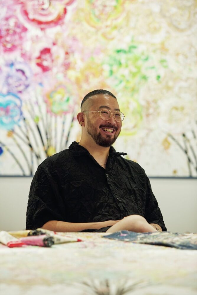 28歳でファッションデザイナーから画家へと転身し、年間40回近い展示を重ねてきた奥田雄太さん。代表作の「花」のシリーズは、種類を特定できない黒い茎の花を描くことで、誰もが自分の記憶や感情を重ねられるようにと考えられている。コロナ禍をきっかけに描き始めた花には感謝の思いが込められ、数を描くことで進化を続けてきた。そんな彼はいま、アートを「砂漠」に、社会を「ジャングル」にたとえ、もともと自分は後者から前者へとあえて飛び込んだ“ジャングルの民”だったと語る。資源も情報もない砂漠を歩くには、自分を信じる強さが必要だと知っているからこそ、戻らずに進み続ける覚悟がある。嫉妬から始まった絵画への道のりは、今では「裸の自分を肯定してもらう喜び」へと変わった。多作大作に挑みながら、自身の喜びと観る人の心を結ぶために花を描き続ける奥田さんに、制作の背景と未来への思いを聞いた。