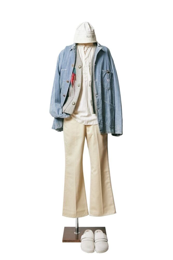 カバーオール27万5000円、パンツ5500円/ともにリー、ベスト4万9500円/トルフィリオス、プルオーバーシャツ8800円、ハット5500円/ともにヴィンテージ、サンダル2万5300円/ビルケンシュトック