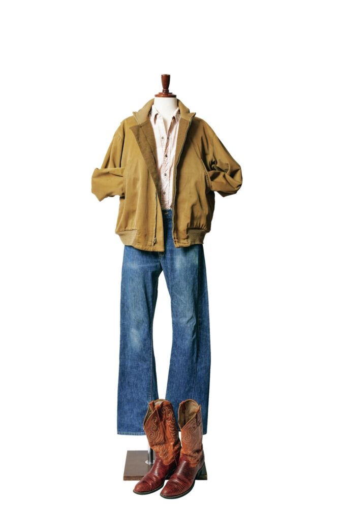 「有名な[M-65]ではなく、タンカースジャケットのシーンを選びました。ポイントはストレートシルエットのデニムにウエスタンブーツという合わせ。ウエスタンブーツには、一般的にはブーツカットを合わせるのが定石だと思われがちですが、膝下ストレートのパンツにもバッチリとハマります。ちなみにロバート・デニーロはバックルの大きなベルトを付けていますが、私はジャストサイズのデニムにはノーベルトを推します。また、トップスをややオーバーサイズにすることで現代的にアップデートしました」
