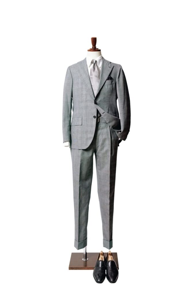 「ケーリー・グラントが劇中のほとんどのシーンで着用していたライトグレースーツの装いを軸に、少しテイストの“足し引き”を加えました。無地と比べるとややカジュアルなグレンプレイドのスーツを選びつつ、劇中にはないチーフや、よりドレッシーな『ジョンロブ』のローファーを合わせることで、ドレッシーとスポーティの間における着地点を微妙にずらしています。エレガントだけど、どこか抜け感がある。そんなスーツスタイルを目指しました。シャツが実はボタンダウンだという点もポイントです」