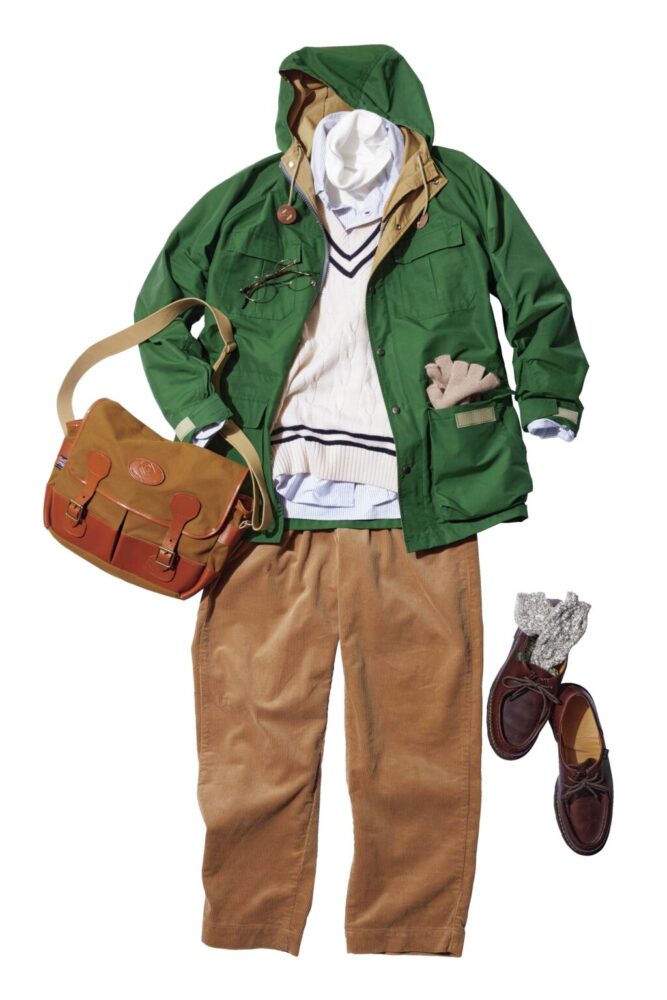 吉村 いわゆる「タフなアイテム」の中でも、コーデュロイパンツに合わせる前提で考えた時に、ツイードのノーフォークジャケットやM‒65などは武骨すぎる。今回はテイクアイビーらしい可愛らしさを出したかったので、レトロなマウンテンパーカにしました。