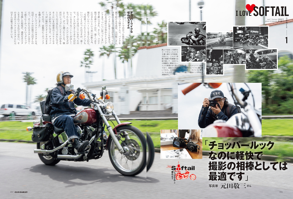ストリートで出会った個性的なバイク乗りやクルマなどを採り続けている写真家の元田さん。楽に長距離を走れるハーレーがほしくなりショップに足を運んだところ、偶然見つけた「FXSTCソフテイル カスタム」にひと目ぼれして購入。そんなオーナーに、ソフテイルとのつき合い方や魅力を教えてもらう。