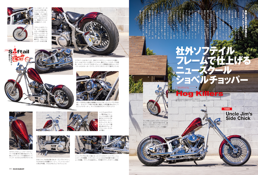 ソフテイルフレームの巧みな設計から、その仕組みを踏襲しながら、より大胆なシルエットを実現した社外フレームも登場している。そんな社外フレームをもとに製作したチョッパーをアメリカで取材。ショベルヘッドエンジンをソフテイルフレームに搭載している点をはじめ、見どころ盛り沢山のカスタムに圧倒される。