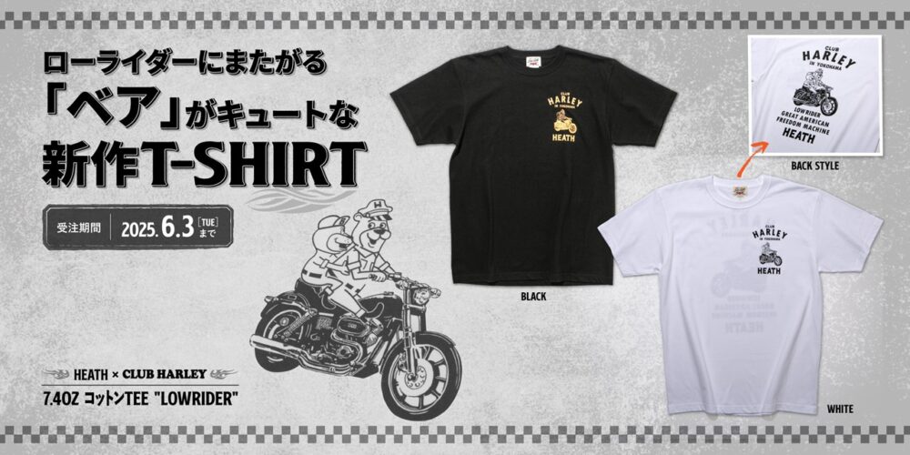 胸元と背中にはHEATH.のオリジナルキャラクター、“HEATH BEAR”がハーレーに乗ったイラストが入ります。このHEATH BEARは熊のエドとマイクのポップな日常を切り取ったシリーズで、これまで750ccバイクやアメリカ車、国産旧車などに乗る姿がHEATHのオリジナルTシャツなどに描かれてきたが、今回のコラボTシャツはそのハーレー版。1977年式FXSローライダーを新たな愛車として乗りこなす姿がかわいくないですか?