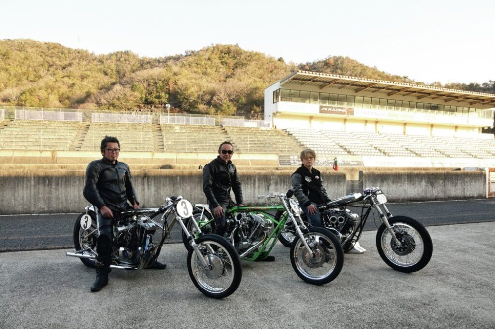 昨年の「ヨコハマホットロッドカスタムショー」に展示されていた「シウンクラフトワークス」、「ホットチョップスピードショップ」、「サカイボーリング」のマシン。シウンとホットチョップはこのマシンでの初めての走行となった。