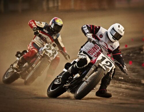 フロントブレーキが付いていないマシンで、後輪を滑らせながら逆ハンを切って楕円のダートコースを駆け抜ける「フラットトラック」レース。その競技で圧倒的な強さを発揮していたのがH-DファクトリーチームのXR750。その雰囲気をスポーツスターに落とし込んだのだ。