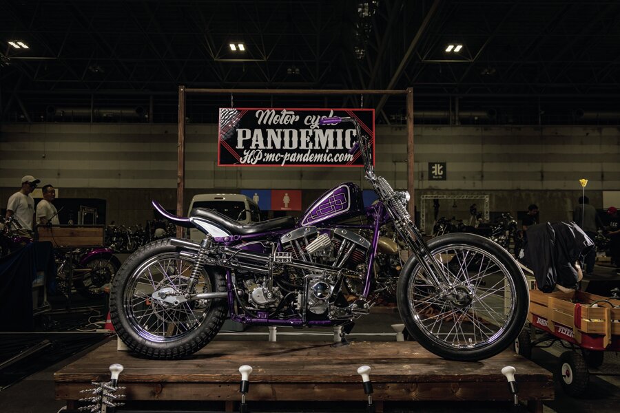 超絶ナローな車体とコンパクトなポジションでこれぞ「ラックMC」のチョッパーと思わせるアーリーショベル。細部まで隙のない作り込みはさすがのひと言。