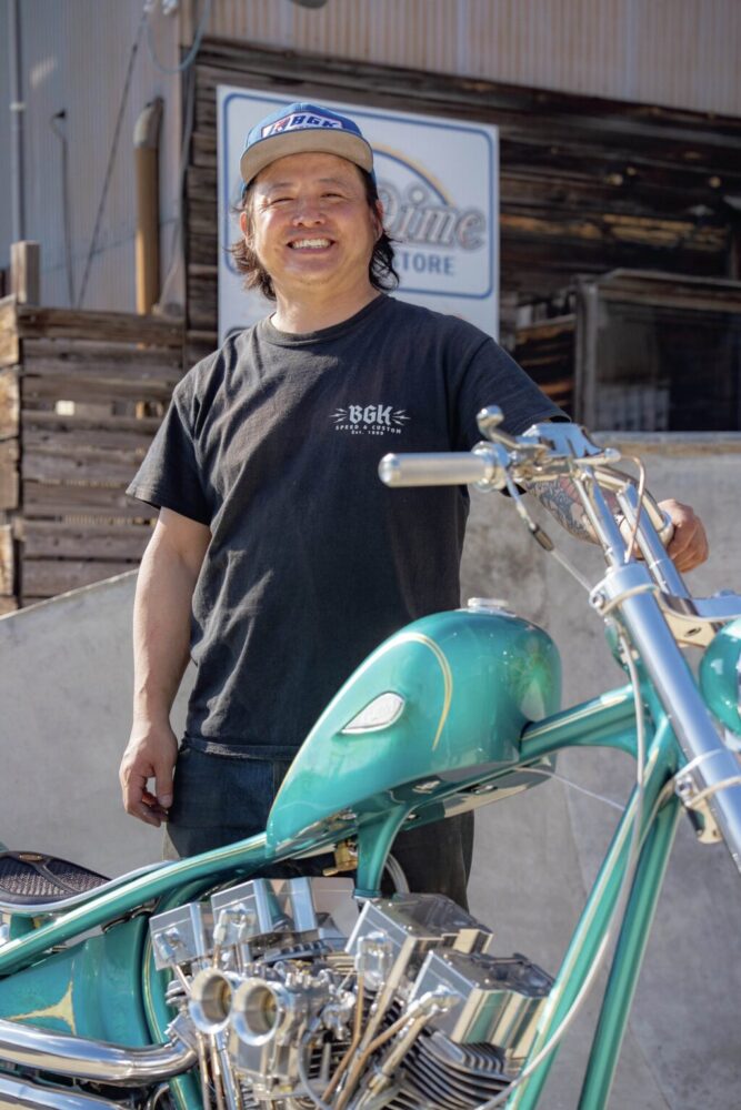 骨格はBGKの黄金比によるワンメイドのストレッチフレームで、ややレイクさせたネックに2インチオーバーの径41㎜フォークをセットし、高速走行での安定性を考慮したディメンション。さらにアールと直線的なラインが入り乱れるデザインによって、立体感のある美しいシルエットを生み出している。