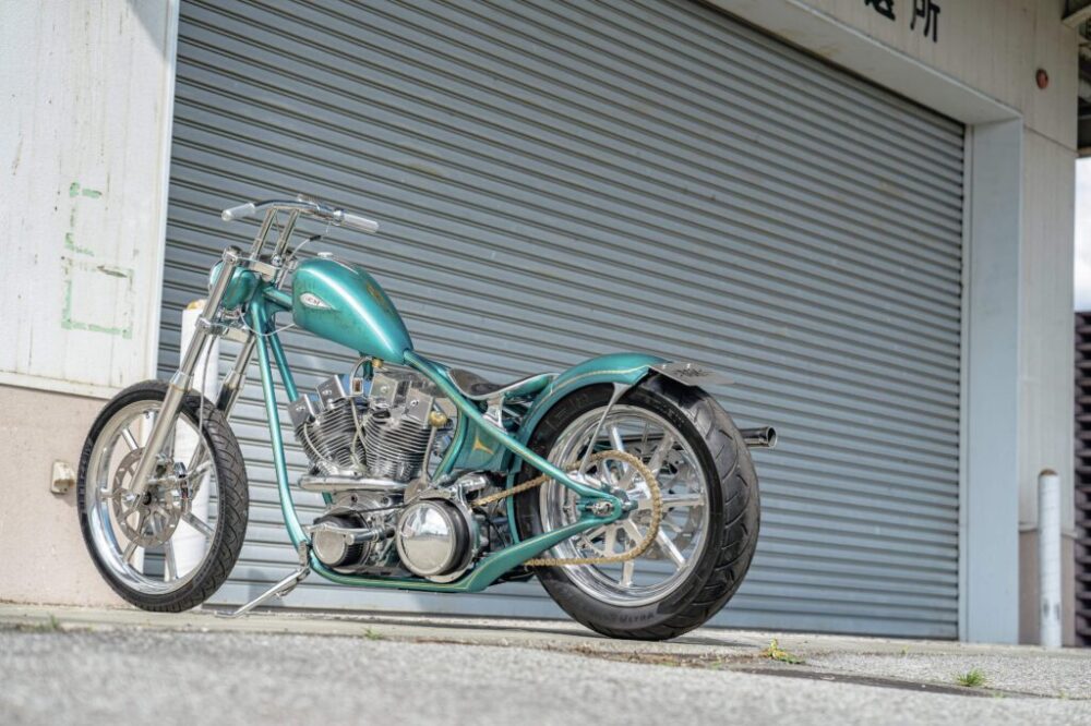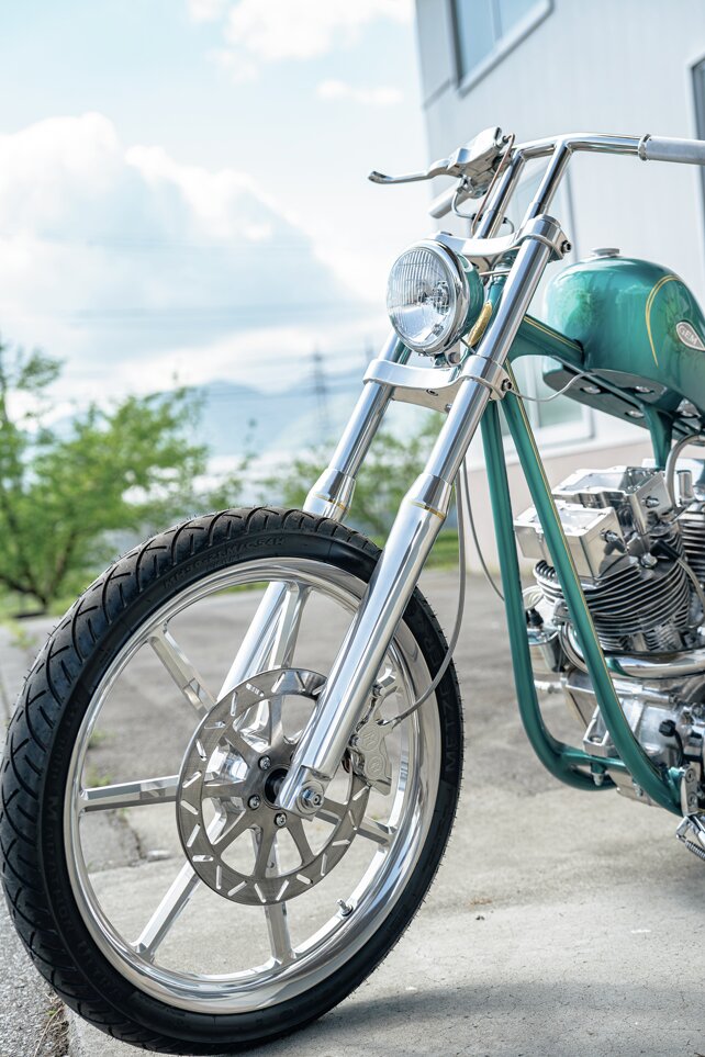 45㎜から48㎜に太さが変化するハイパイプにビレットエンドを装備。ステップは削り出しで製作。各部にブラスのスペーサーを加えた配色も見逃せない。