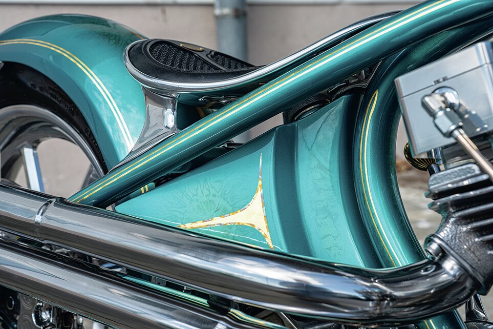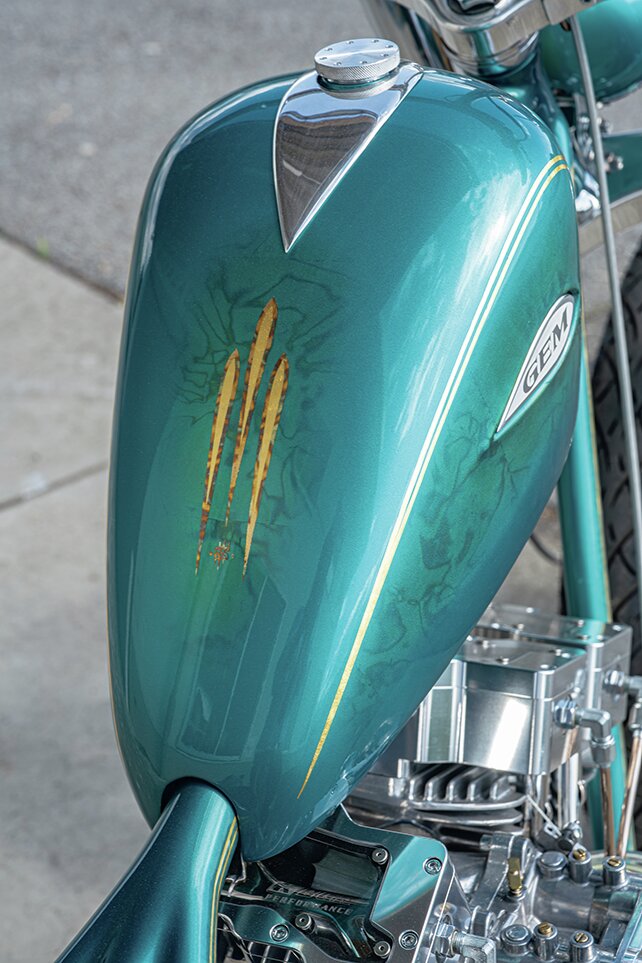 スポーツスターのような造形のハイマウントタンクは前面がほぼ垂直に立ち上がる独特なシルエット。ペイントはブルーのベースに焼き色のリーフやパール、メタリック、キャンディをミックスした高度なカスタムペイント。ペイントはBGK&SANO、ピンストライプは「SUGI SACK STUDIOS」によるもの。