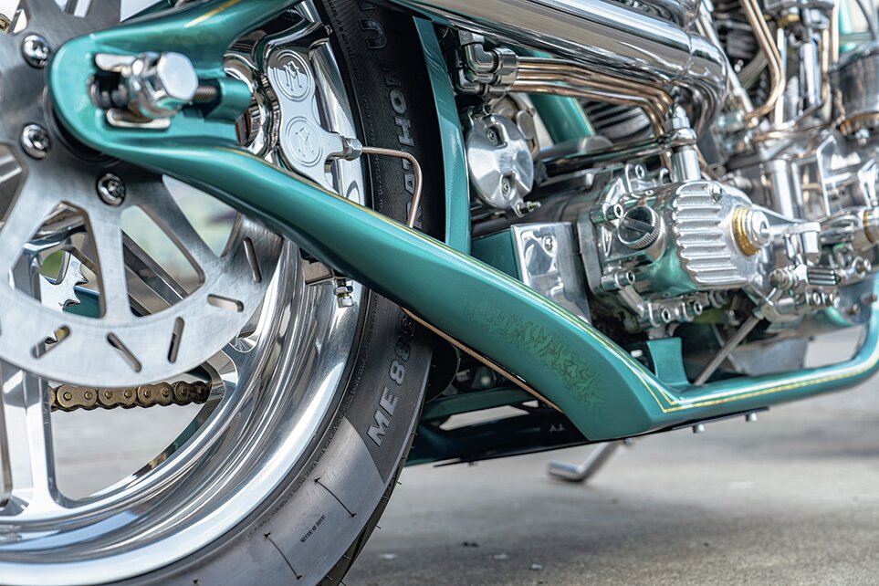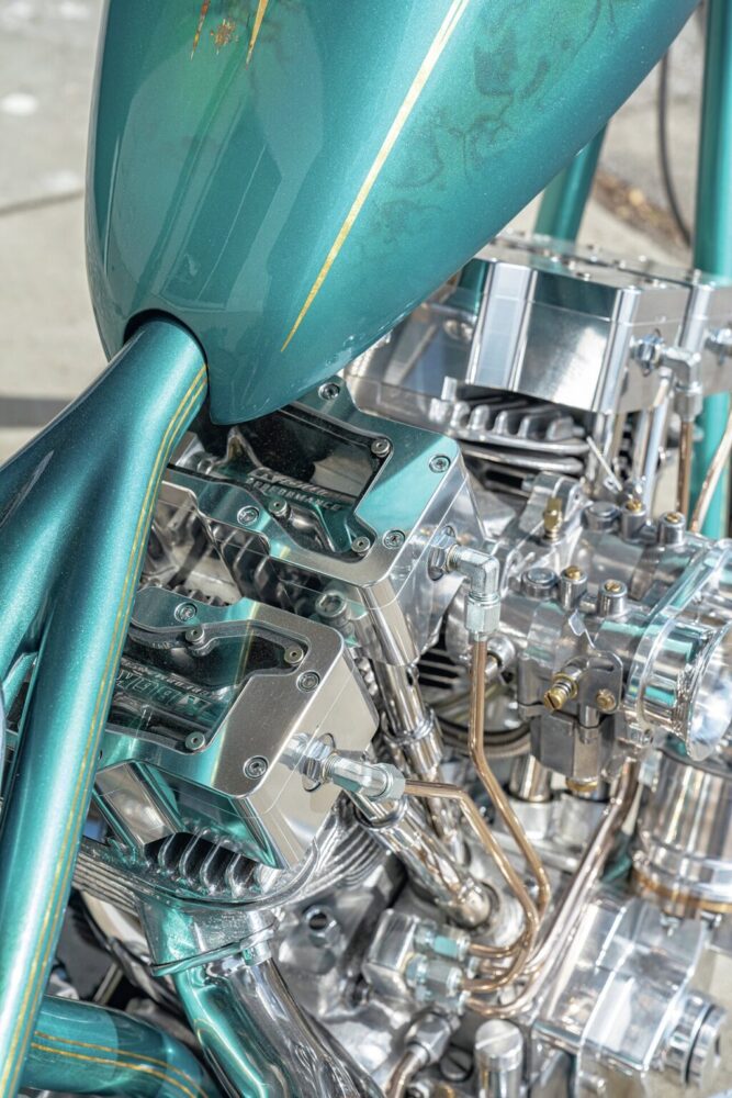 パットケネディ製をモチーフにオリジナルで製作したスプリットロッカーは上面がスケルトンのため、バルブの動きを視覚的に確認できる。すべてパイピングに変更したオイルラインも注目。