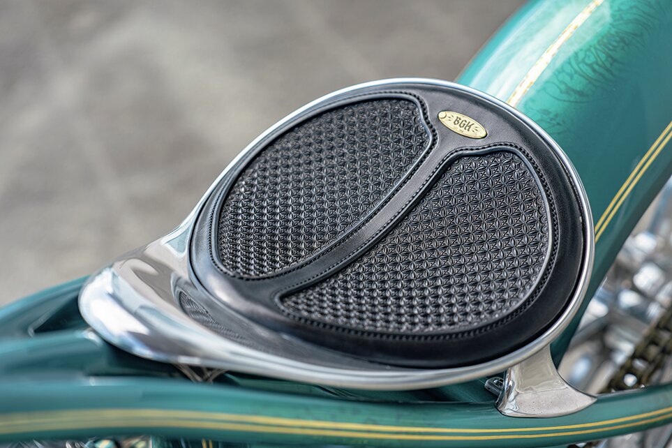 シートはベースをアルミで製作し、「ジミードープ」が本革のバスケットレザーを張ったワンメイド。薄くコンパクトなデザインだが中空の設計でクッション性を高めた。