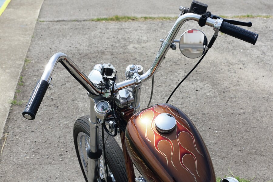 ハンドルはシウンオリジナル。加藤さんが一番気に入ったポイントがブロンズ系ペイントのフレイムス。ファットボーイにもフレイムスを入れているそうだ。