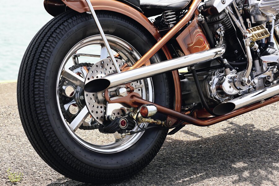 リアにインベーダーホイールを採用している点もこのチョッパーのポイント。ブレーキはPM製のヴィンテージタイプに交換。