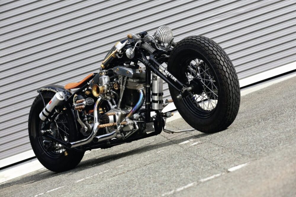 グースネックフレームに備えたスプリンガーフォークに太いフロントタイヤで低く構えた独特のルックス。タンク容量の少なさを補うためにサブタンクを追加している。