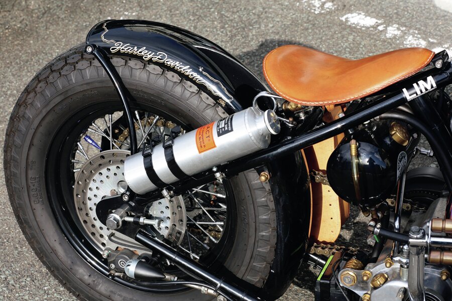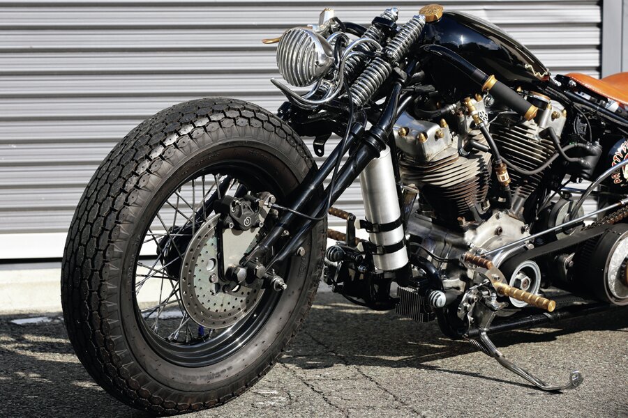 ベースは1976年の「FLH」でエンジンはストックの1200㏄。購入後にブラス製のファンネルやペグ類、タンクキャップなどをワンオフで製作して装着している。