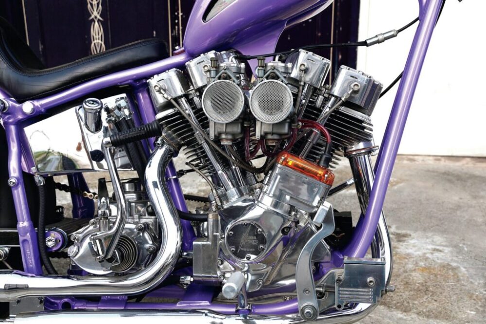 排気量は1200㏄のストックだがマーレー製のピストンを使用して圧縮を上げている。パットケネディーズ製ロッカーボックスと「XR1000」の純正キャブレターとして知られるデロルト製をXRと同じく2連装することで迫力のある見た目を実現。インテークマニホールドはシウンオリジナル。モーリス製マグネトーのキャップをクリアオレンジに塗装することでアクセントをつけた。エンジンの仕上げはフルポリッシュだ。