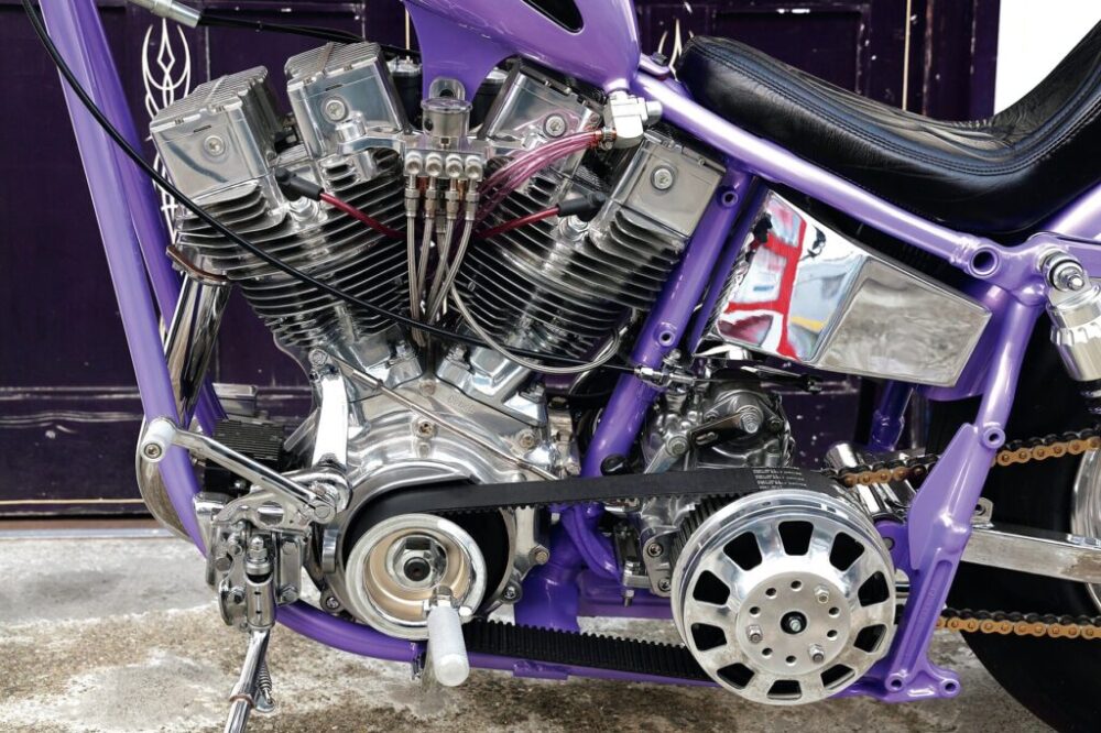当初は、オリジナルの状態のイメージでブロンズにするつもりでいたが紫に変更。クラック塗装という手法を使い血管をイメージした模様をタンクに浮かび上がらせ、全体は紫のパール塗装。この2つを違和感なくタンクの上にペイントすることが一番苦労するポイントになった。