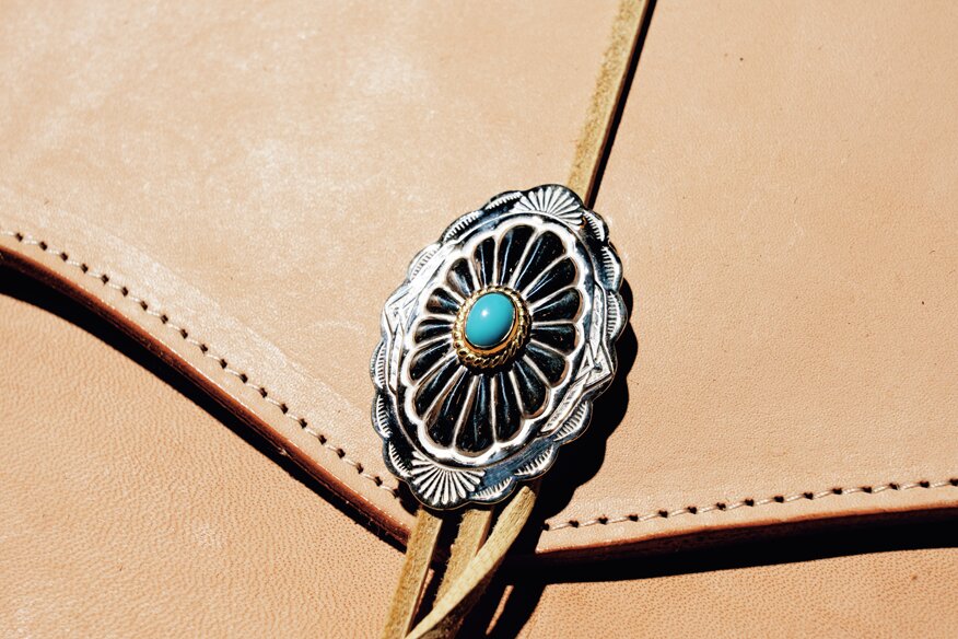 フラワーモチーフのシルバーをベースにゴールドの縄を巻いたターコイズのトップを加えたコンチョ。ケースがシンプルゆえに、コンチョが差をつける。