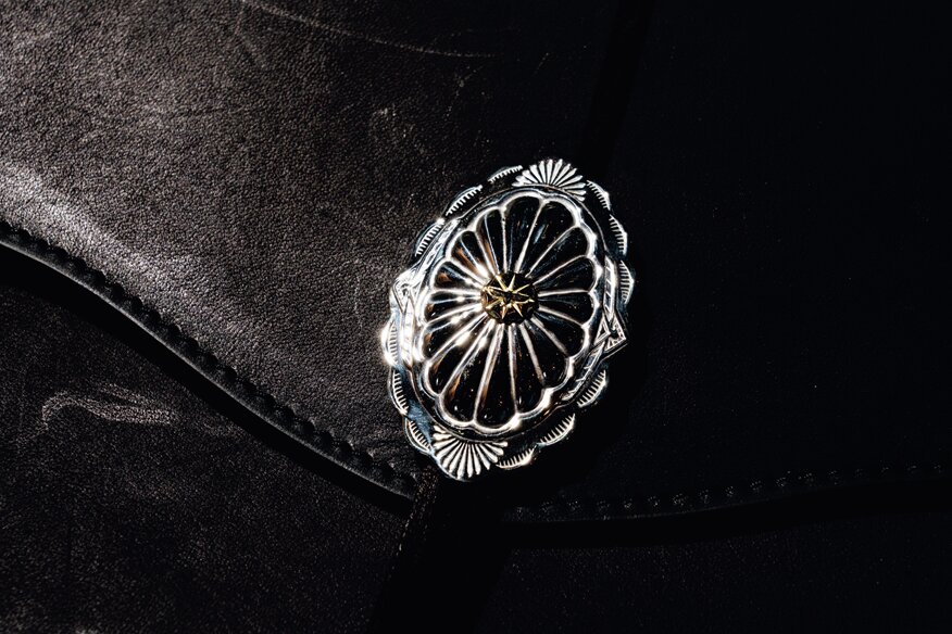 フラワーモチーフのシルバーコンチョのトップに、太陽とイーグルをモチーフとしたK18メタルを装備するゴージャスなコンビデザイン。