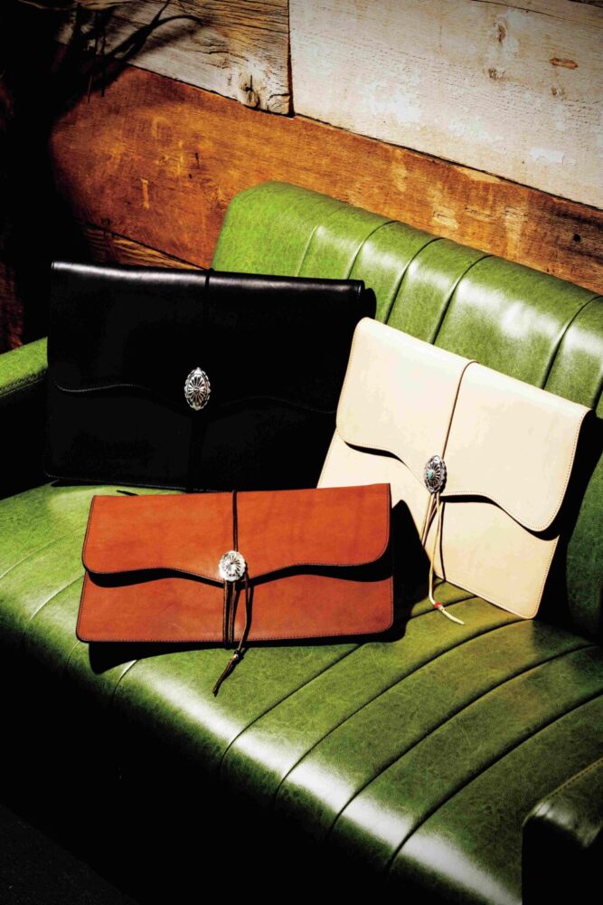 働く現代人のために開発されたラップトップケース。サイズは14インチと16インチ。ネイティブデザインのコンチョやロープ付きのデザインなど、旧さと新しさが共存するアイテムだ。都会のオフィスにも溶け込むタフでレトロなレザーケースをビジネスシーンで使い続ければ愛着もひとしおに違いない。