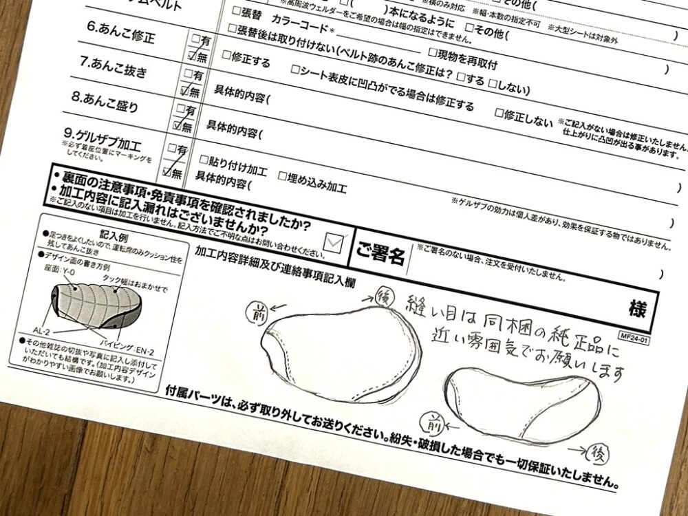 依頼する際はホームページからオーダー表をダウンロードして希望する内容を記入。これをシートとともに送るのだが、その際、ステーなどは外しておく。私の場合は純正レザーが残っていたので見本として同梱した。