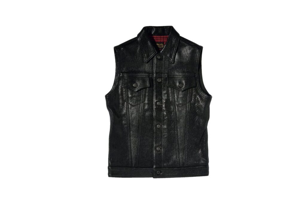 デニムジャケットのデザインを採り入れたゴートスキンベストは、バイクを降りたときのカジュアルウエアとしても申し分なし。革の品質に自信があるからこそ可能な素仕上げなので、山羊革の素材の魅力が存分に味わえるのもポイント。2.2mmという厚さだが、シボが多いため柔らかく着やすいのがうれしい。12万9800円