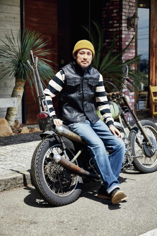 レザーベストとカットソーをレイヤードした王道スタイルの矢澤店長。太いピッチのボーダーでバイカースタイルを強調しつつも、力の抜けた自然体なコーディネートが好印象。誰でも簡単に実践できる組み合わせなので、レザーベストを検討している人は、参考にしてみては?