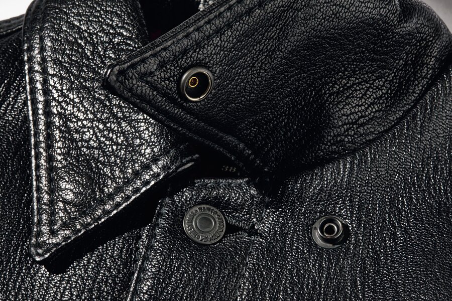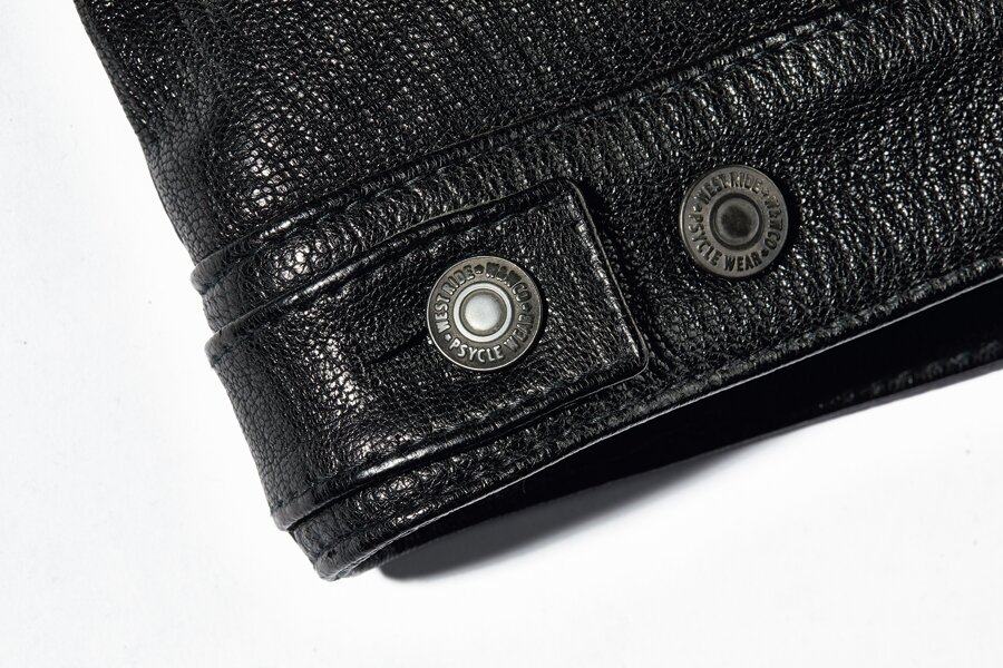「ゴートスキンは雨に強く、耐久性も高いため、バイクウエアとして優れた素材です。しかも、ウエストライドで使う山羊革は2ミリ前後の厚さなのに素仕上げ。これは上質な素材だからこそできる仕様なんです。また表情豊かな独特のシボや艶感は革ジャン愛好家にも人気がありますが、柔らかく身体に馴染みやすいため、実は革ジャン初心者にもオススメです」