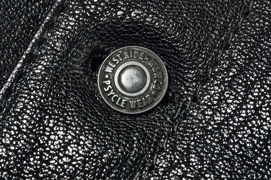 フロントなどで使われるスナップボタンは、ウエストライドの刻印が施された特注パーツ。革とともにエイジングしていくのも楽しみだ。