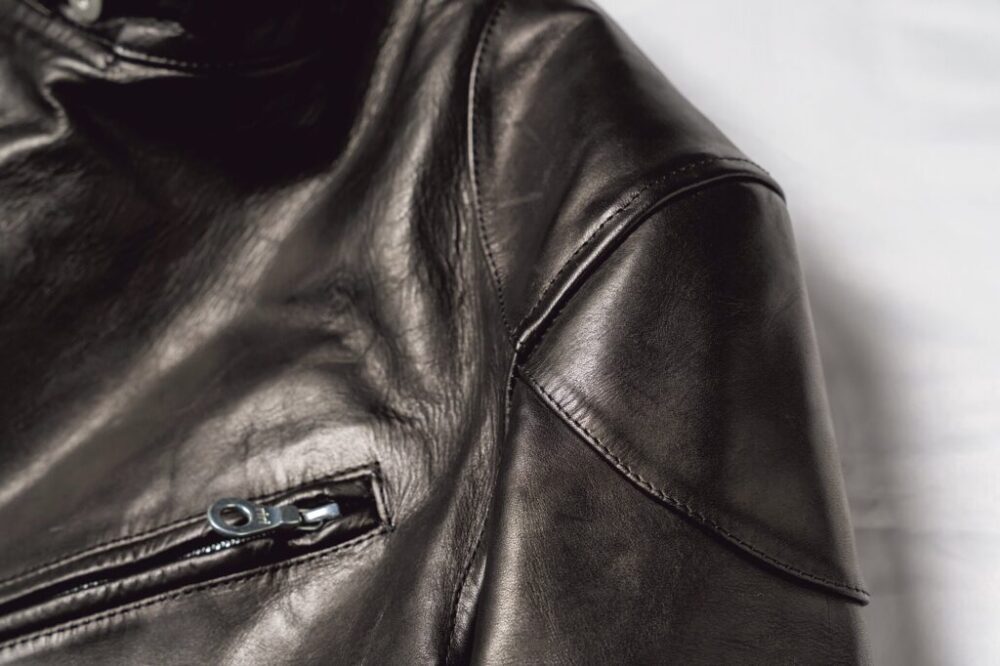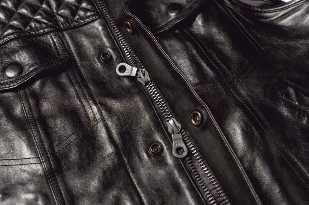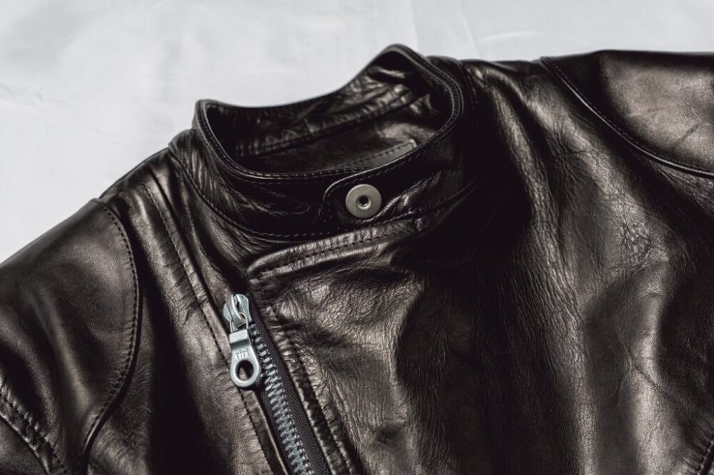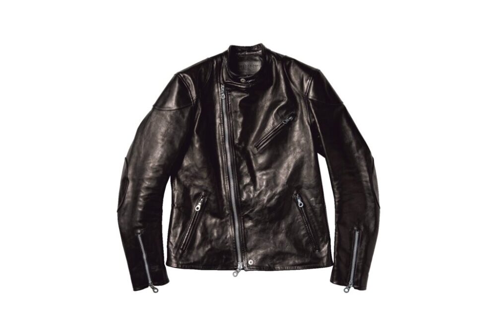スタンダカラーやショルダーの切り替えなどのスポーティなシングルのテイストと、重厚なダブルライダースのテイストをミックスしたデザインがお見事。モダンなシルエットに加え、RIRIZIPPERのダブルジップを用いるなど、ヴィンテージと差別化している。24万2000円
