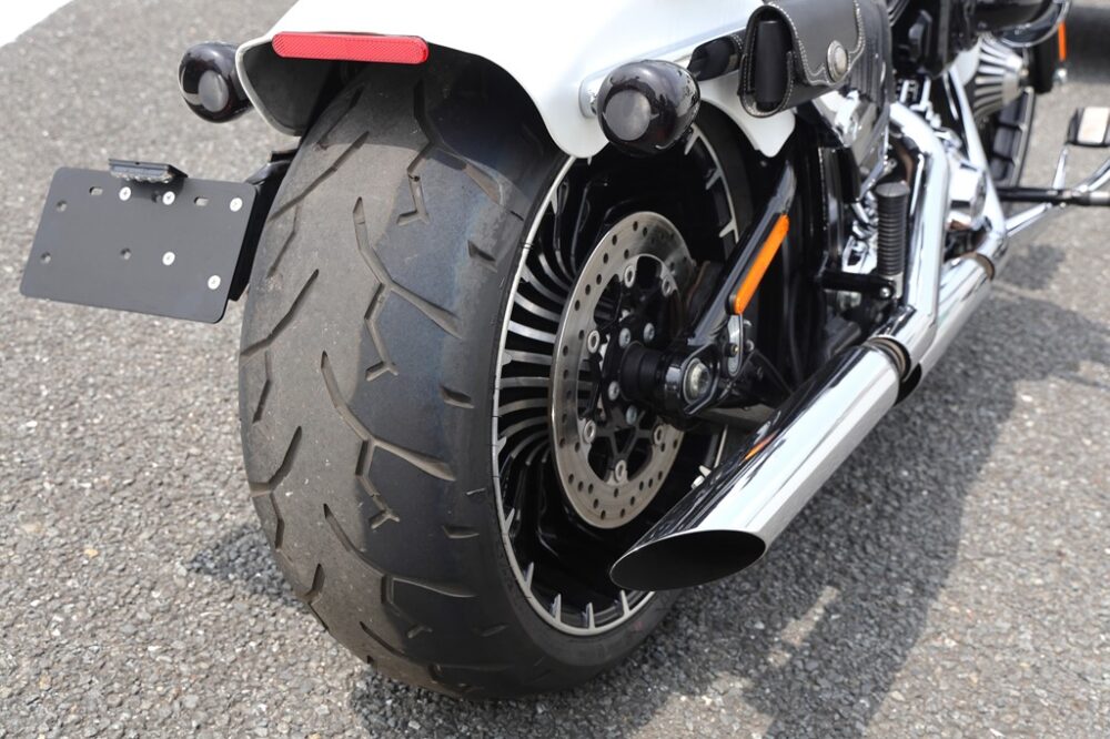 ブレイクアウトの人気が高い理由のひとつが、ド迫力のリアビューを実現する240サイズの超極太リアタイヤ。あまりに太いため操縦性はややクセ強めだが、このルックスには欠かせない。