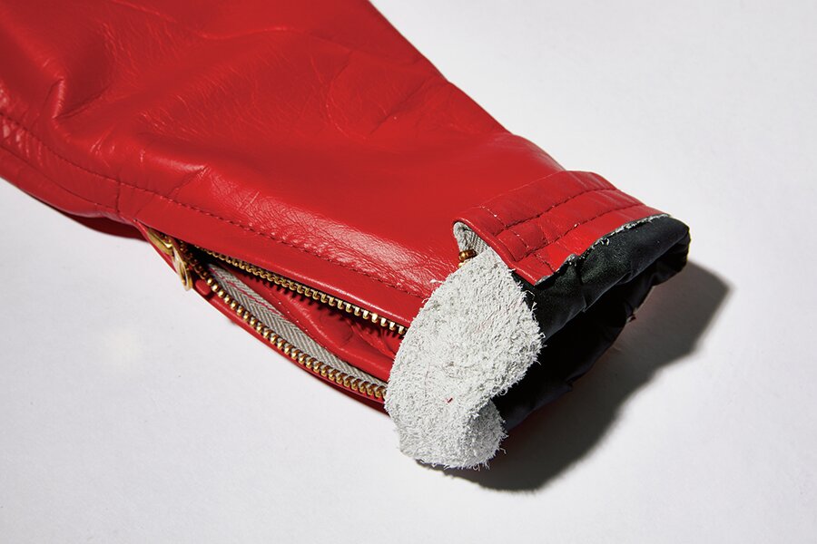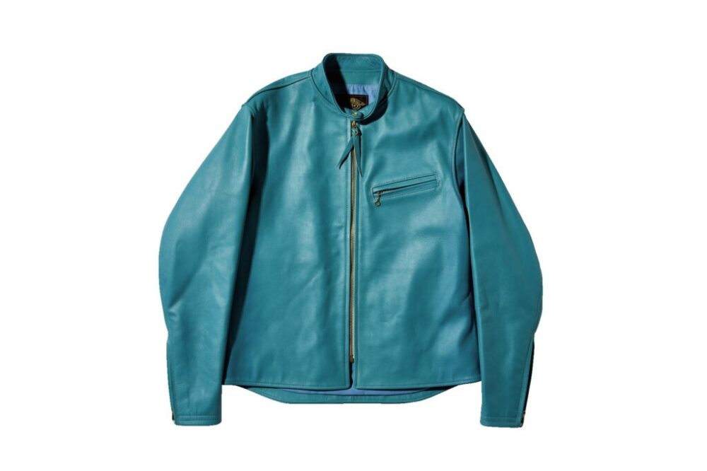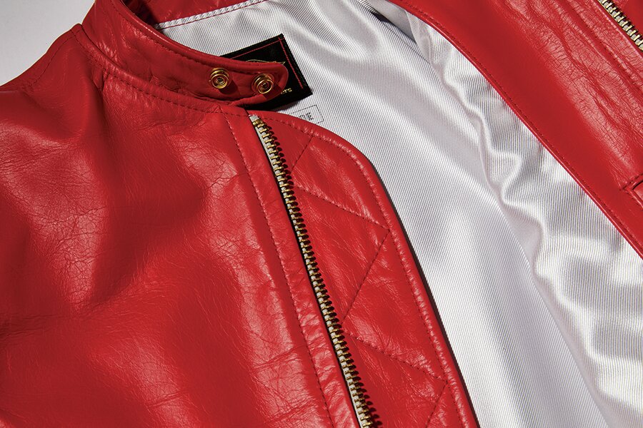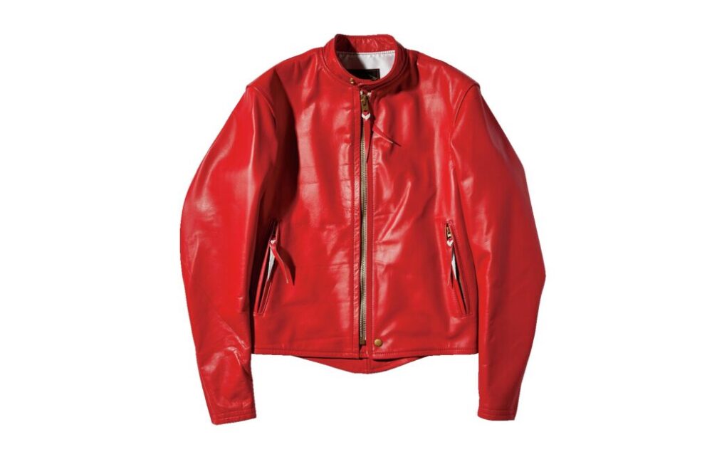 鮮やかな赤い革を使ったシングルライダース。革は牛革のクロム鞣しで厚さは約1㎜なので気軽に羽織れるのがうれしい。アクションプリーツを省略したタウンユースも意識した作りだが、前傾のソデ付けになっているためライダースとしての機能も十二分に備えている。18万1500円