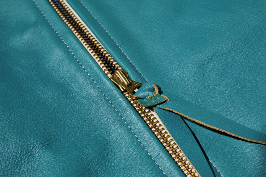 ジッパーはWALDESの5番で統一したことで、軽い見た目を生み出した。ファスナーテープは白で、縫製糸はグレーを採用した爽やかな仕様。